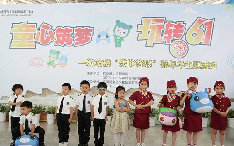5月27日上午10点,杭州机场航站楼里如往日一般繁忙,人来人往,出发大厅突然传来一阵音乐声,紧接着数十名年仅6、7岁的孩子们蹦蹦跳跳着从四面八方涌了出来,他们欢笑着,跳跃着,用略显稚嫩、却不乏自信的舞步把欢乐和童真带给现场的每一位旅客。小朋友中间,还有一个可爱的和乐比人偶。短短几分钟后,按耐不住的小旅客们也加入其中,舞蹈人群越发庞大,天真、烂漫的舞蹈将活动推向高潮,匆忙赶路的旅客纷纷驻足拍照和录影留念。